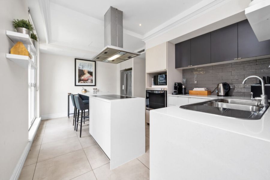 - Kitchen with island bench, fridge, oven, cooktop and dishwasher