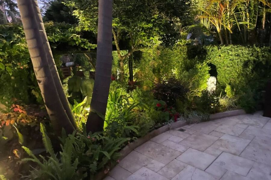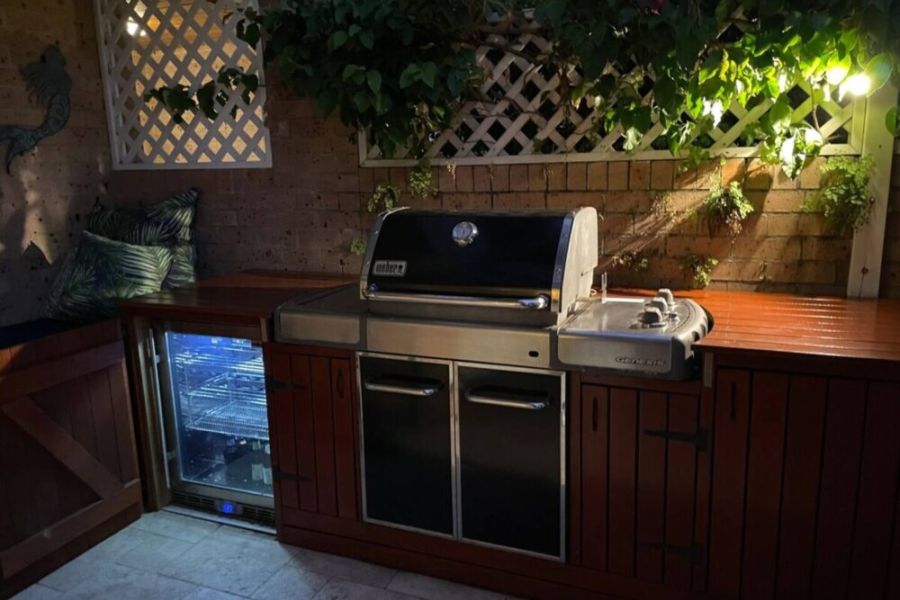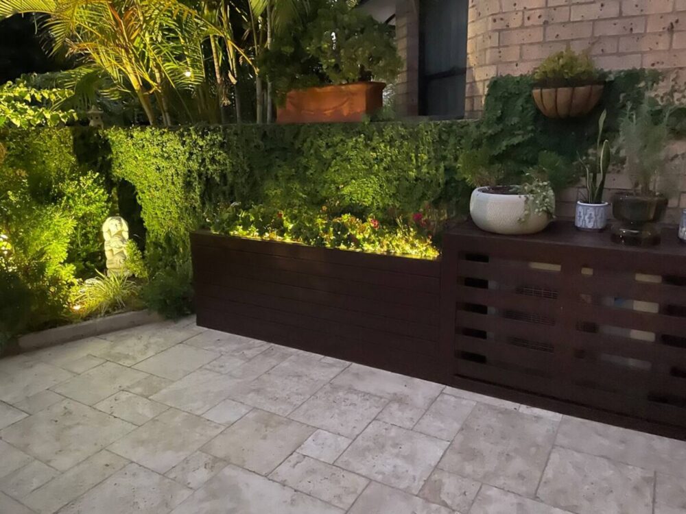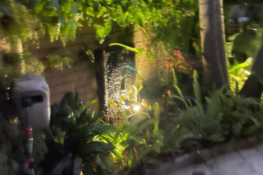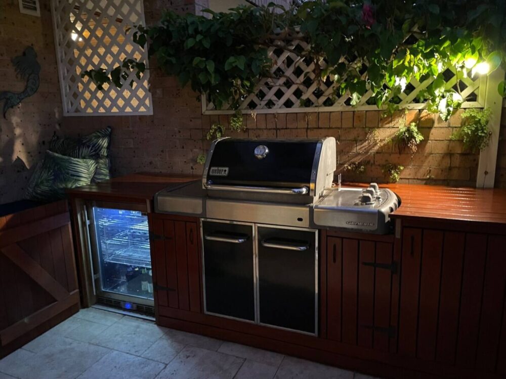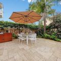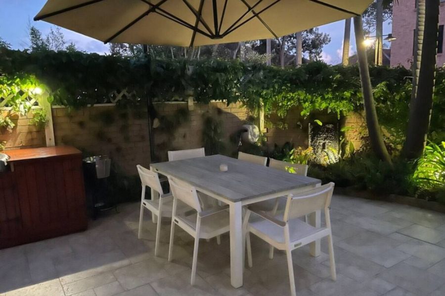 You will love the spacious garden courtyard of this apartment, it’s an entertainers delight. This 45 square meter travertine paved area has a small but luscious garden with mature palm tree and water fountain. During the day relax under the four meter square commercial umbrella that cantilevers to any position you desire. The six seater teak table is ideal for long lunches or leisurely evening meals prepared on the Weber BBQ that runs on mains gas (no refilling of gas bottles). Alongside the Weber BBQ is an outdoor drinks fridge for storing those cold drinks on warm days/nights. Underneath the kitchen window is a day-bed perfect for relaxing with your favourite book. The courtyard comes alive at night where a number of strategically placed lights showcase the foliage and features including the water fountain. Plates, cutlery and glassware are stored in the outdoor BBQ cabinetry for your ease of use.