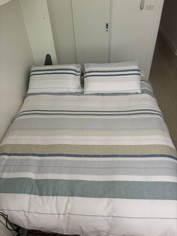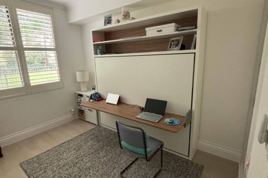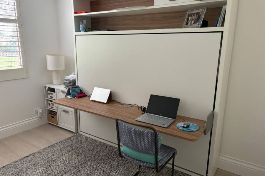 The Italian engineered wall bed is a horizontally opening queen size wall bed, with a large desk. By day, if required, the large desk acts as the perfect work/study area. By night, it transforms into a queen size bed with comfortable memory foam mattress.