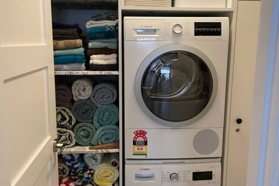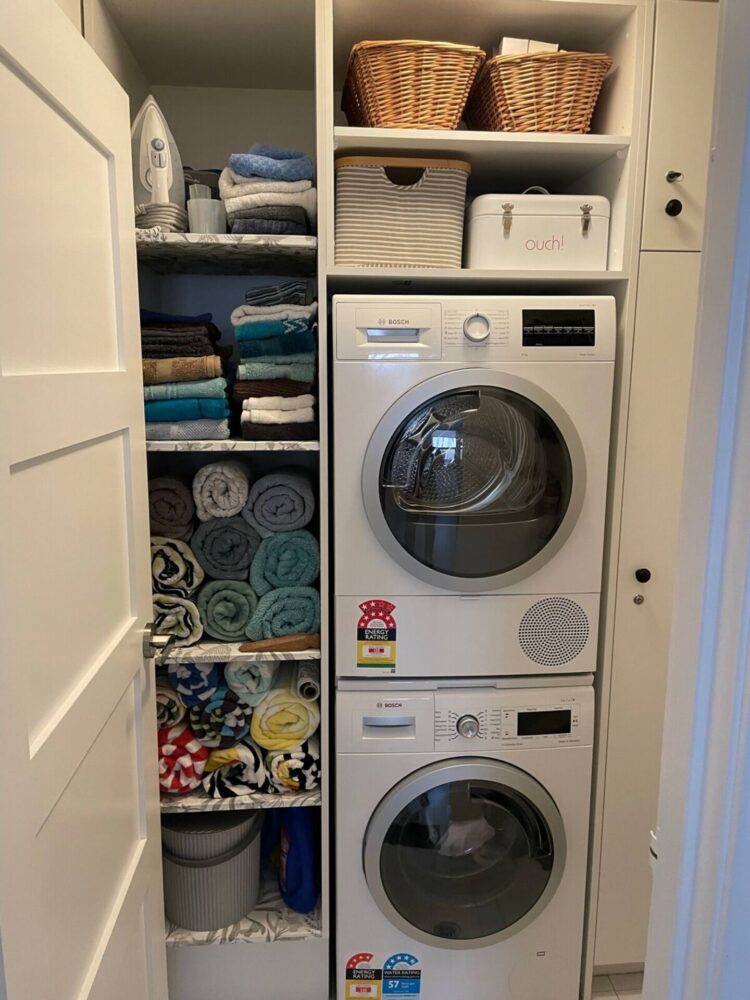The laundry tucked away adjacent to the kitchen stores a top loading washing machine and a new LG wand vacuum cleaner.