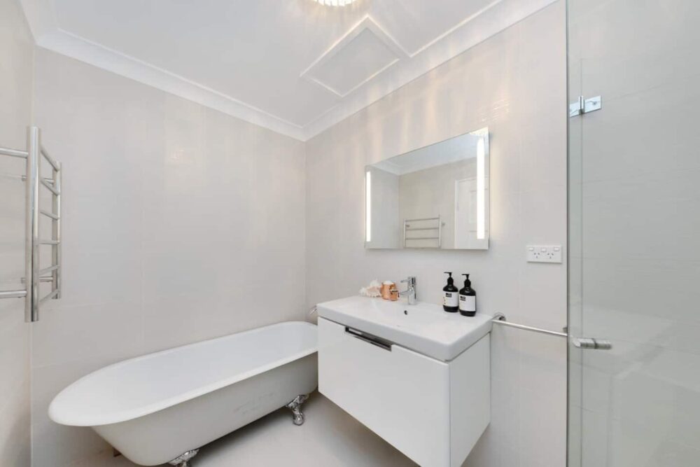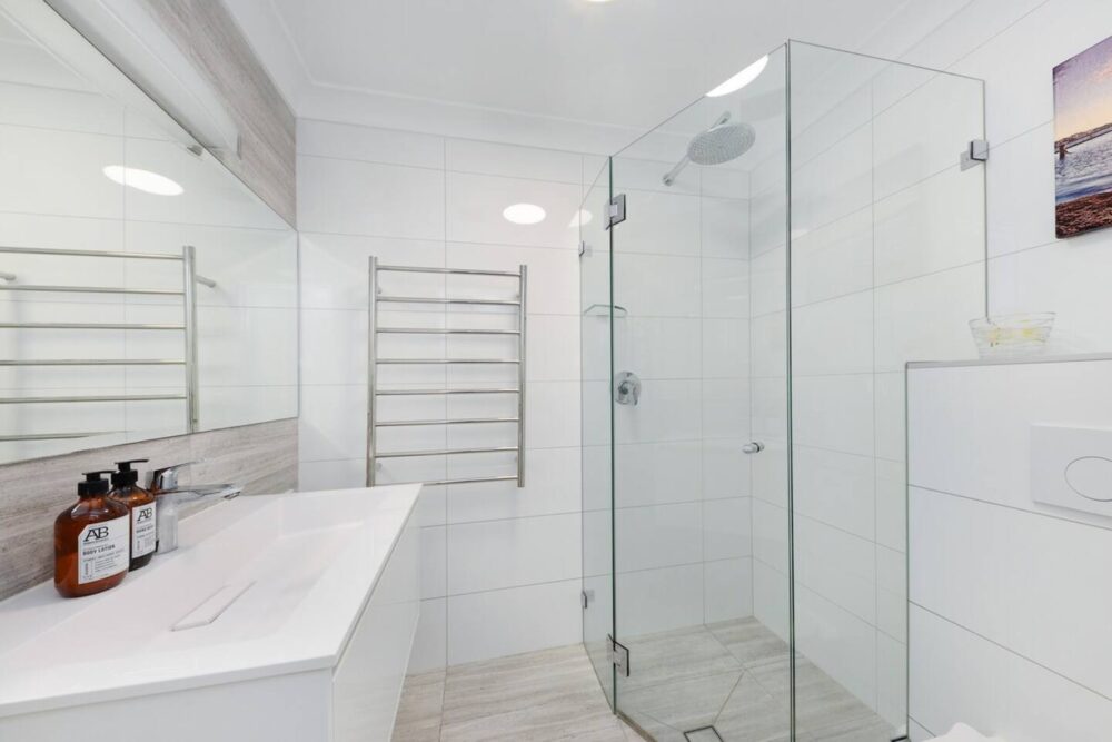 There is a chic floor to ceiling tiled main bathroom with suspended vanity, rainforest shower, full claw bath and suspended toilet. It also has heated towel racks and a clever wall mirror with inbuilt light. The main bedroom has a chic ensuite again with quality wall to ceiling tiles, rainforest shower and suspended vanity and toilet. A heated towel rail and Sheridan quality towels are provided.